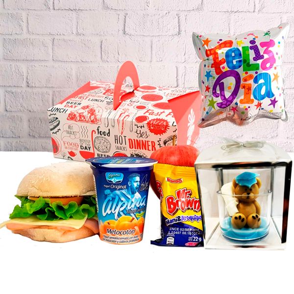 ¡Celebra ese gran logro académico con una sorpresa deliciosa y saludable! Nuestro Desayuno Sorpresa Ligero de Grado a domicilio en Bogotá es la manera perfecta de felicitar a tu ser querido en su graduación. Este desayuno balanceado viene en una hermosa caja de regalo e incluye un sustancioso Sándwich Gourmet, Yogurt Alpina y Manzana fresca, junto a un Mini Brownie. El detalle más especial es la Figura artesanal de Oso con Diploma y Birrete en Cera, un adorno simbólico y aromático de felicitación, acompañado de un Globo de 4". Si buscas enviar un regalo de graduación saludable con adorno temático a domicilio en Bogotá para ese nuevo profesional, ¡esta opción Ligera de Grado es la más original para celebrar su éxito!