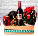 Guacal en madera con mantel decorativo. Dentro del guacal se incluyen los siguientes productos: