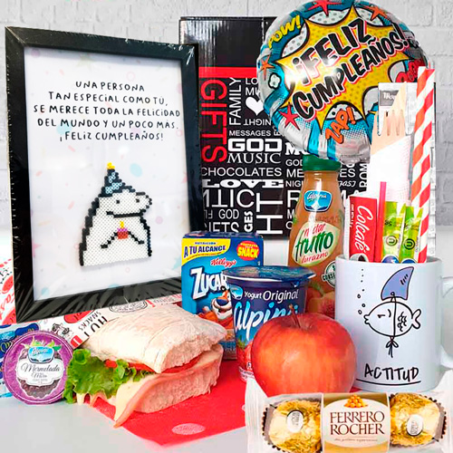 ¿Buscas un desayuno sorpresa a domicilio en Bogotá que sea delicioso y deje un recuerdo permanente? Nuestro Desayuno Caja Cuadro es la ancheta ideal para cualquier celebración, destacando por su regalo único: un hermoso Cuadro recuARdos® de Hammabeads hecho a mano (13x18 cm), que se convierte en una pieza decorativa inolvidable. El desayuno es completo: incluye un sustancioso Sándwich Gourmet, Cereal en caja, Yogurt Alpina, Jugo Frutto, Manzana y el toque de lujo con Ferrero Rocher X3. Además, viene con un Mug de regalo, Café y un Globo de 9" personalizable. Si quieres enviar un regalo con desayuno y cuadro decorativo artesanal a domicilio en Bogotá, ¡esta es la sorpresa más original y memorable para esa persona especial!