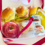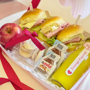 - 3 mini sándwich gourmet preparados con pan suave, jamón, queso y vegetales frescos.